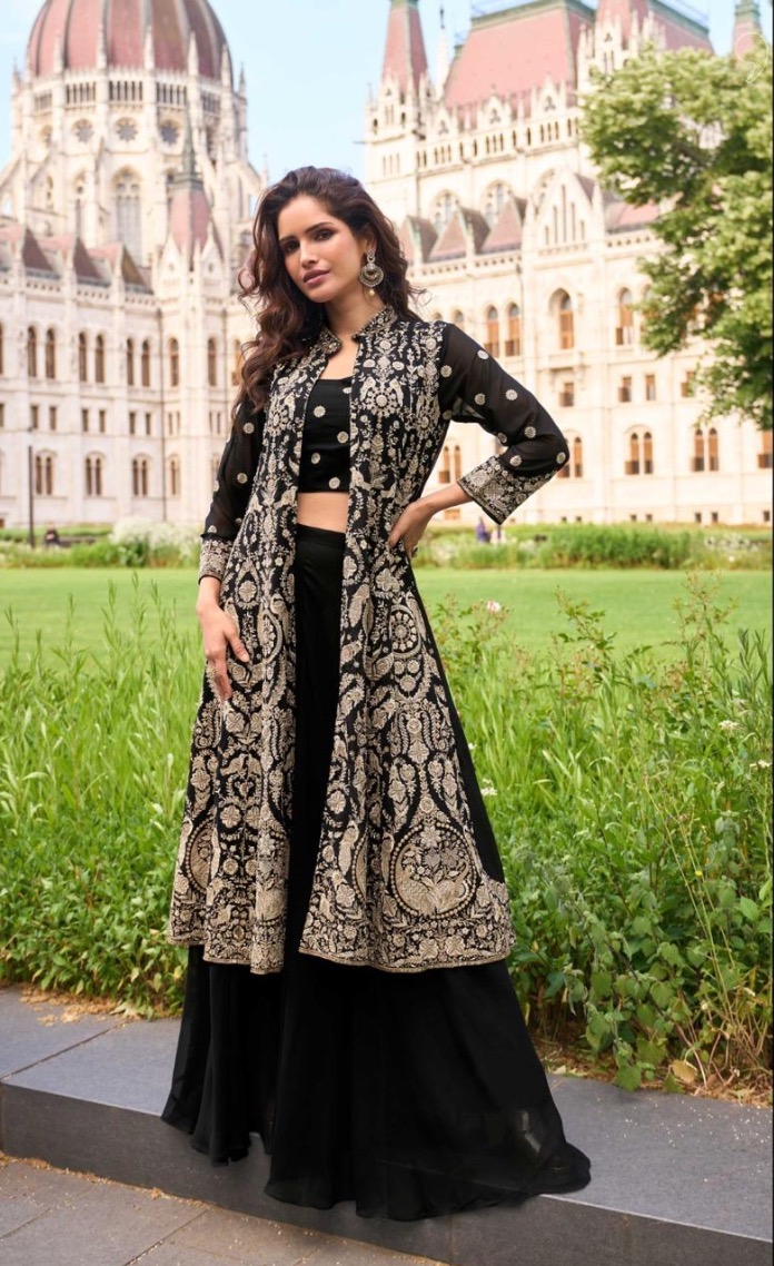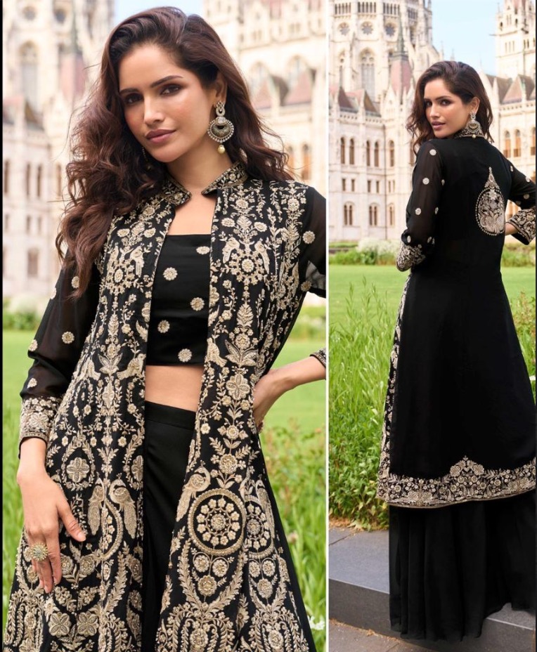 Sankranti special - Charcoal designer 3 piece set. HEAVY EMBROIDERED BEADS WORK FRONT AND BACK SHRUG WITH EMBROIDERED BLOUSE AND PLAZZO